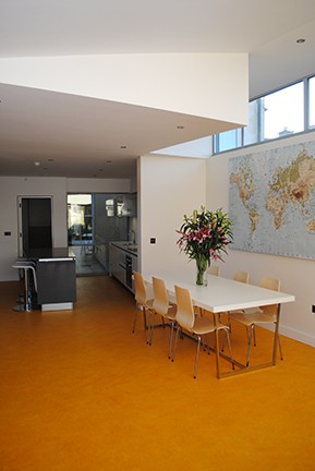 The addition attempts to overcome the difficult aspect and geometry of the North facing garden. The existing courtyard area to the rear of the existing house is retained and the new addition continues from the kitchen and bathroom annex in the original house.